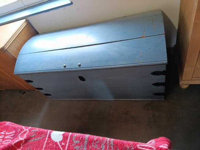 SKRZYNIA NIEBIESKA DĘBOWA 700 Stary, niebieski kufer z widocznymi śladami użytkowania. Może służyć jako praktyczna ...